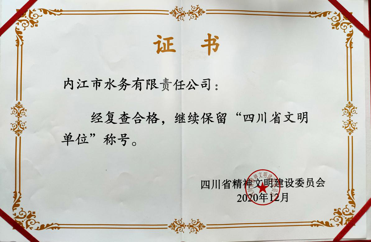近年來(lái),市水務(wù)公司黨委始終以*新時(shí)代中國(guó)特色社會(huì)主義思想為指導(dǎo),推進(jìn)精神文明建設(shè)工作不松勁,抓好生產(chǎn)經(jīng)營(yíng)工作促發(fā)展,推動(dòng)公司精神文明和物質(zhì)文明建設(shè)的雙豐收。根據(jù)四川省精神文明建設(shè)委員會(huì)《關(guān)于復(fù)查確認(rèn)繼續(xù)保留稱(chēng)號(hào)的四川省文明城市、文明村鎮(zhèn)、文明單位、文明家庭、文明校園的通報(bào)》(川文明委〔2020〕20號(hào)),內(nèi)江市水務(wù)有限責(zé)任公司順利通過(guò)復(fù)查,繼續(xù)保留“四川省文明單位”榮譽(yù)稱(chēng)號(hào)。
