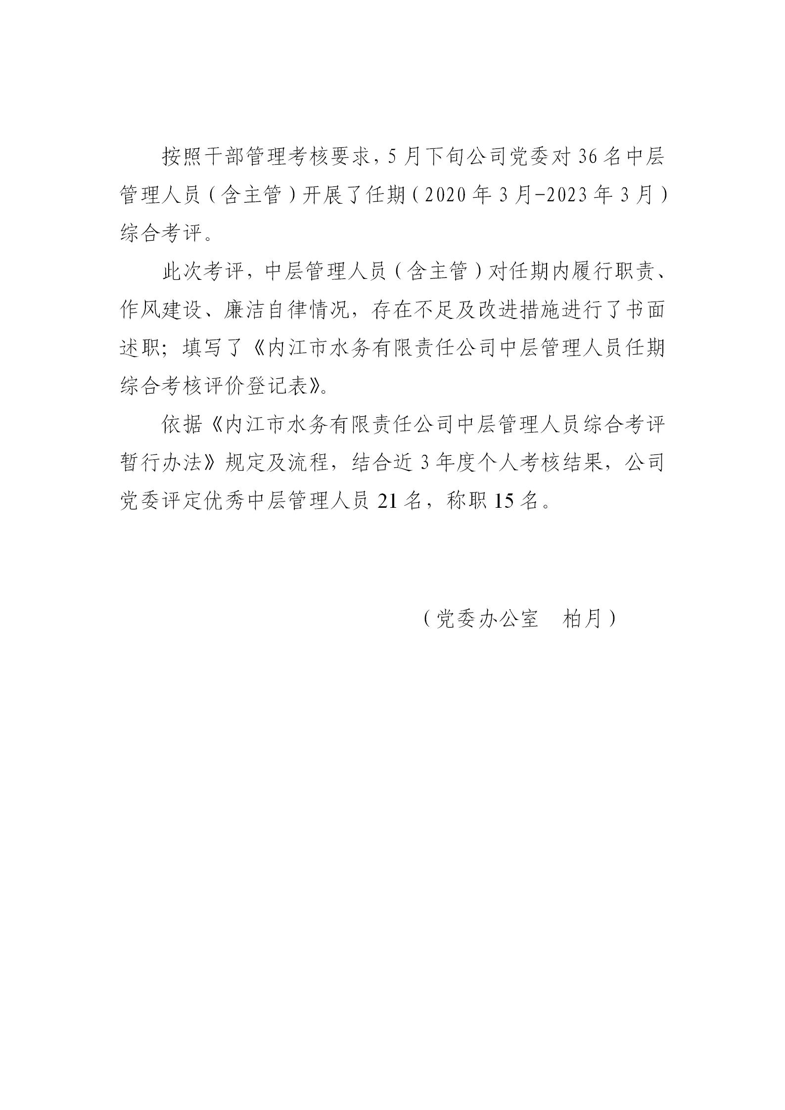 公司黨委開展中層管理人員任期綜合考評