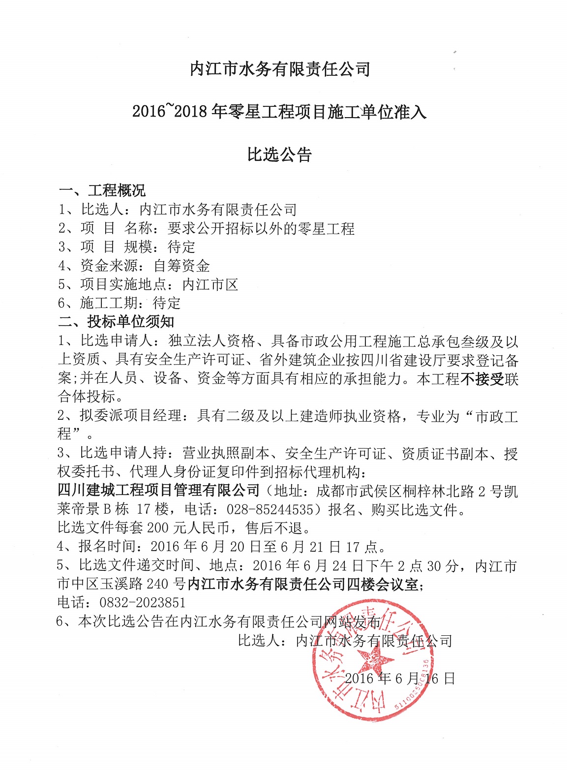 內江市水務有限責任公司2016~2018年零星工程項目施工單位準入比選公告