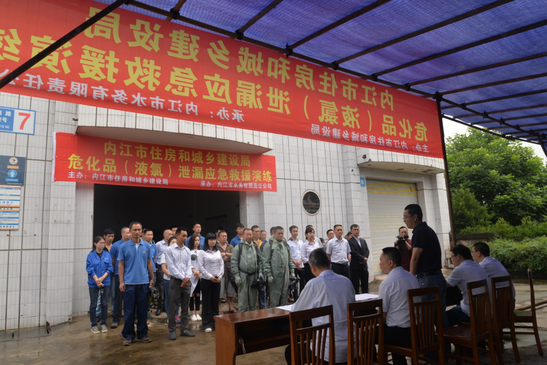2017年6月16日上午,為做好?;钒踩芾砉ぷ?,保安全供水,公司在二水廠成功進行液氯泄漏應急救援演練。本次演練,由市住建局主辦、公司承辦,公司黨委書記、董事長、總經理寧印福任總指揮,總工程師蒲彬任現場總指揮,生產技術部組織,二水廠具體實施,共計 50多人參與演練。