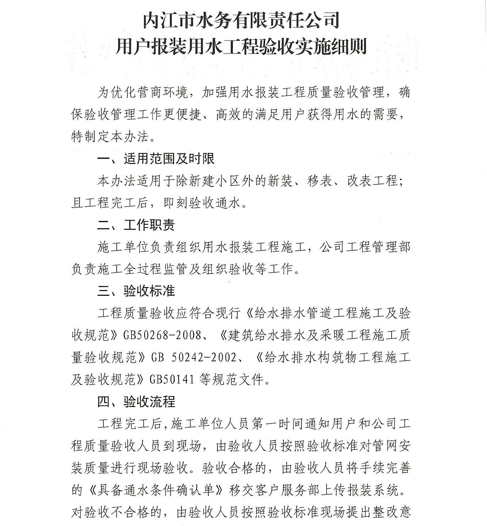 內江市水務有限責任公司用戶報裝用水工程驗收實施細則